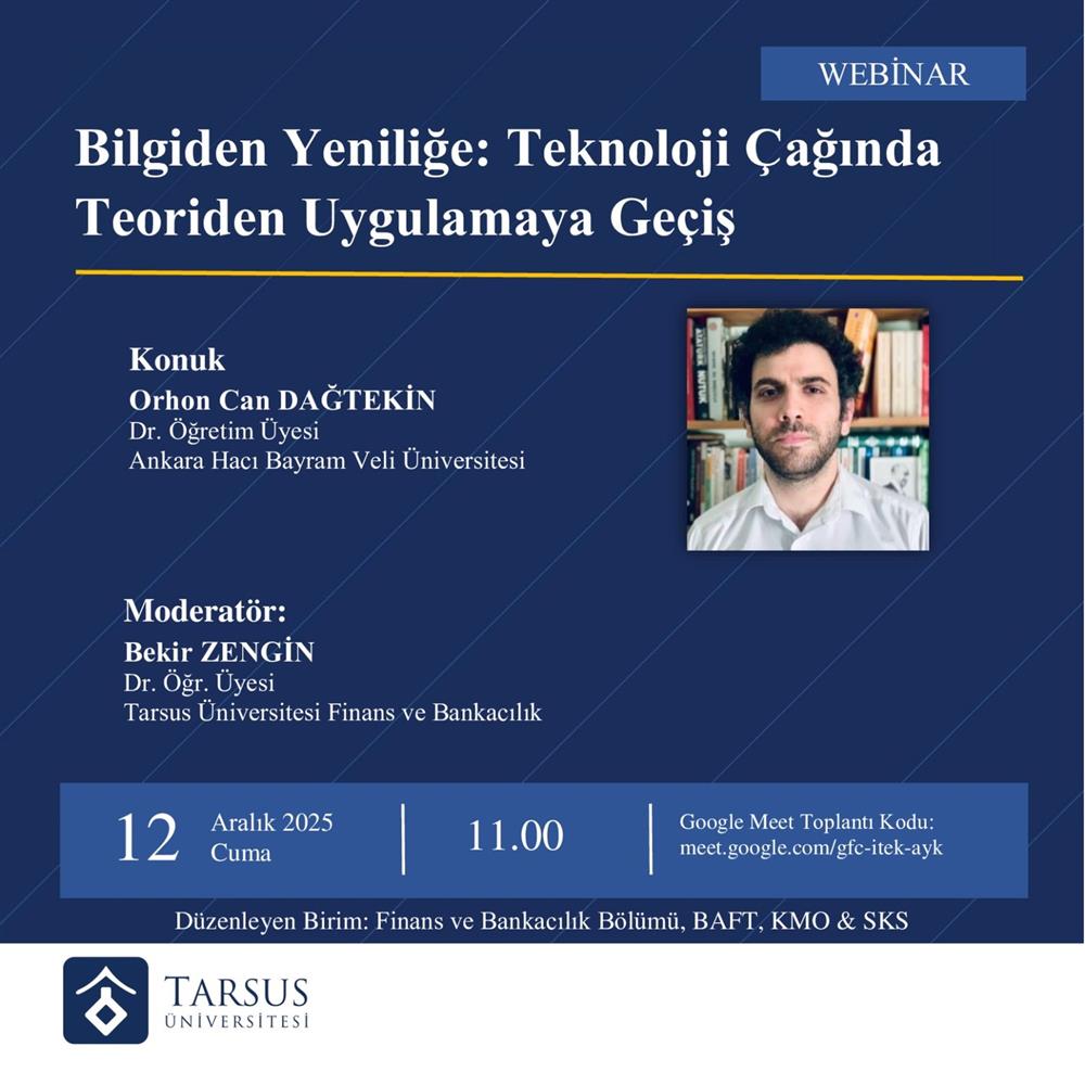 Bankacılık ve Finans Öğrenci Topluluğu, Finans ve Bankacılık Bölümü, Kariyer ve Mezun Ofisi işbirliğinde düzenlenen Bilgiden Yeniliğe: Teknoloji Çağında Teoriden Uygulamaya Geçiş" adlı online seminer 12 Aralık 2025 Cuma günü saat 11.00'de gerçekleştirilecektir.